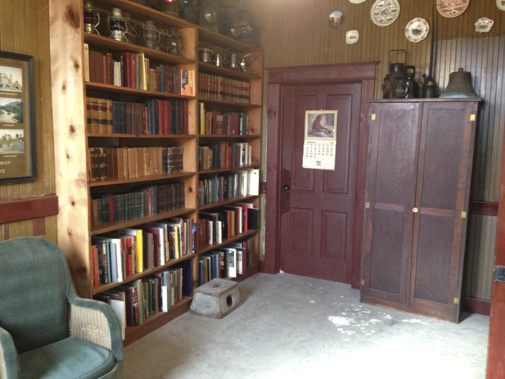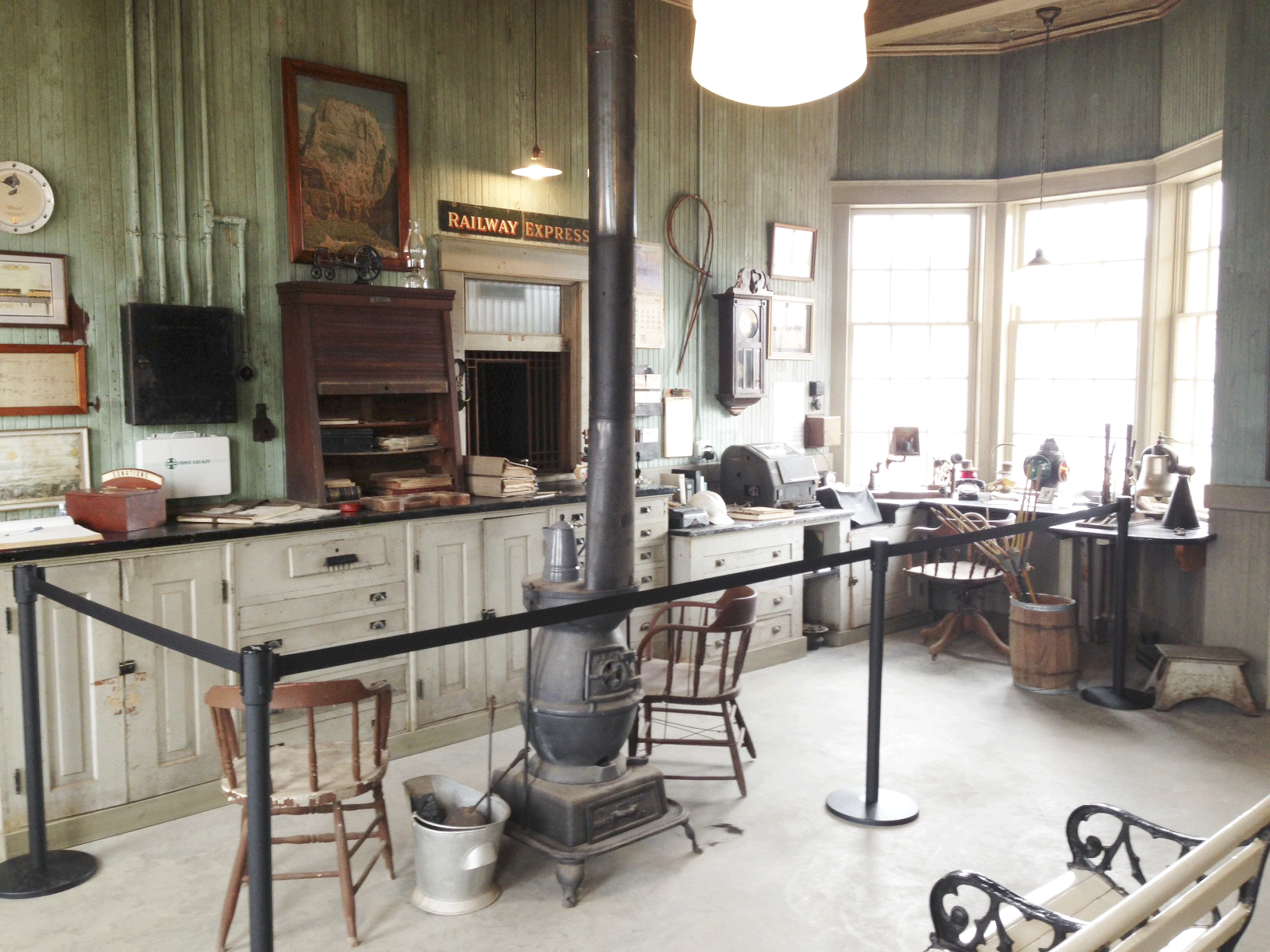 The depot exhibits a great variety of railroad artifacts and rail memorabilia. There is a large collection of kerosene burning lanterns, uniform items, timetables, switch keys, locks, signal equipment, dining car china, silver settings, Fred Harvey items, a very extensive railroad library, bells, station signs, models, coach items, Pullman items, drinking glasses, badges, dining car chairs, linens, early day Santa Fe Transit, railroad advertising items, fire extinguishers, tools, furniture, stoves, official guides, and innumerable miscellaneous items of railroad heritage.